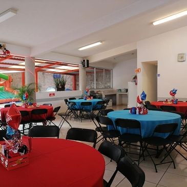 Paquete de contratación con mobiliario de 50 personas adultas y 30 niños, área de juegos, futbolito, juegos infantiles, cancha de futbol e inflable o trampolín, estacionamiento y personal de apoyo. Se encuentra ubicado en la zona de la Col. Candiles
